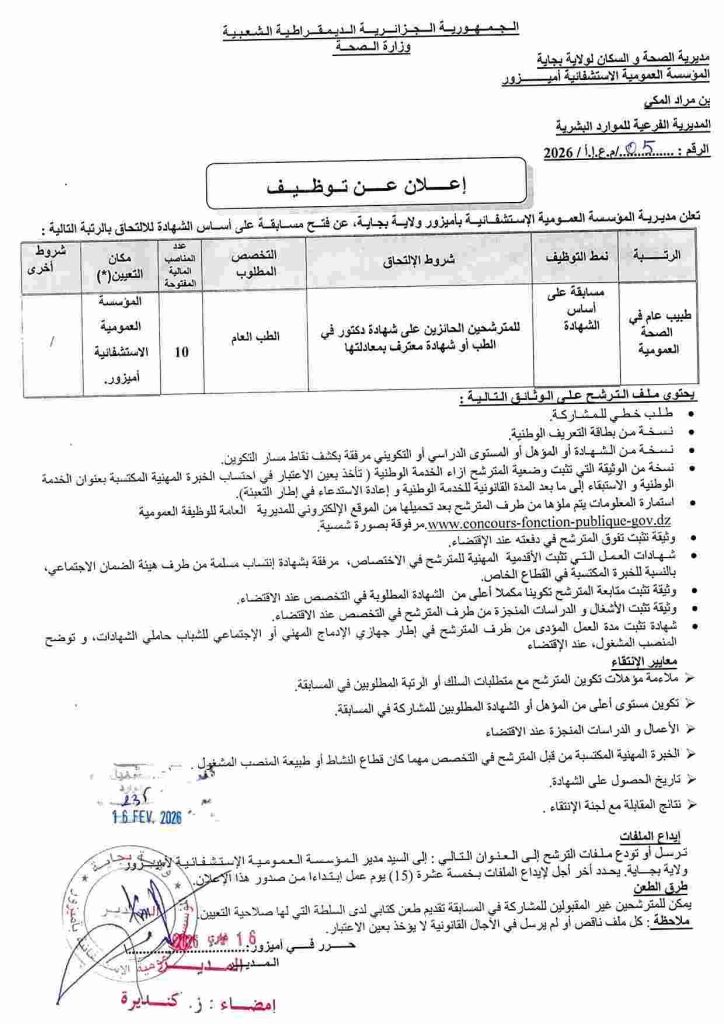 | طبيب عام في الصحة العمومية | مسابقة على أساس الشهادة | للمترشحين الحائزين على شهادة دكتور في الطب أو شهادة معترف بمعادلتها | الطب العام | 10 | المؤسسة العمومية الاستشفائية أميزور | / |