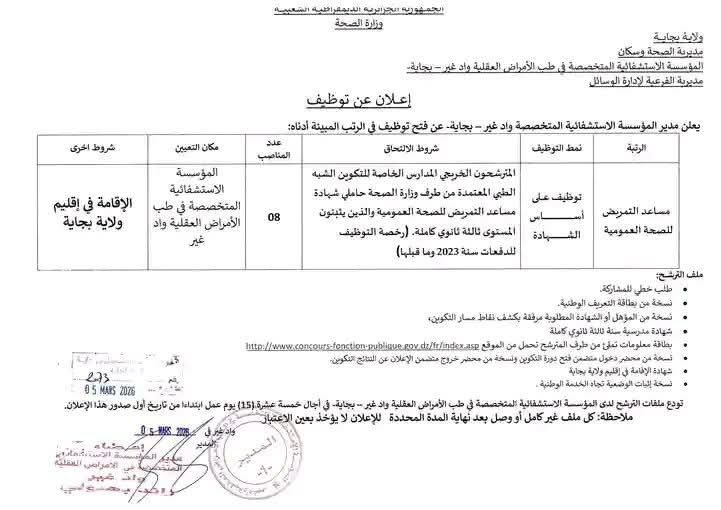 يعلن مدير المؤسسة الاستشفائية المتخصصة واد غير – بجاية – عن فتح توظيف في الرتب المبينة أدناه: