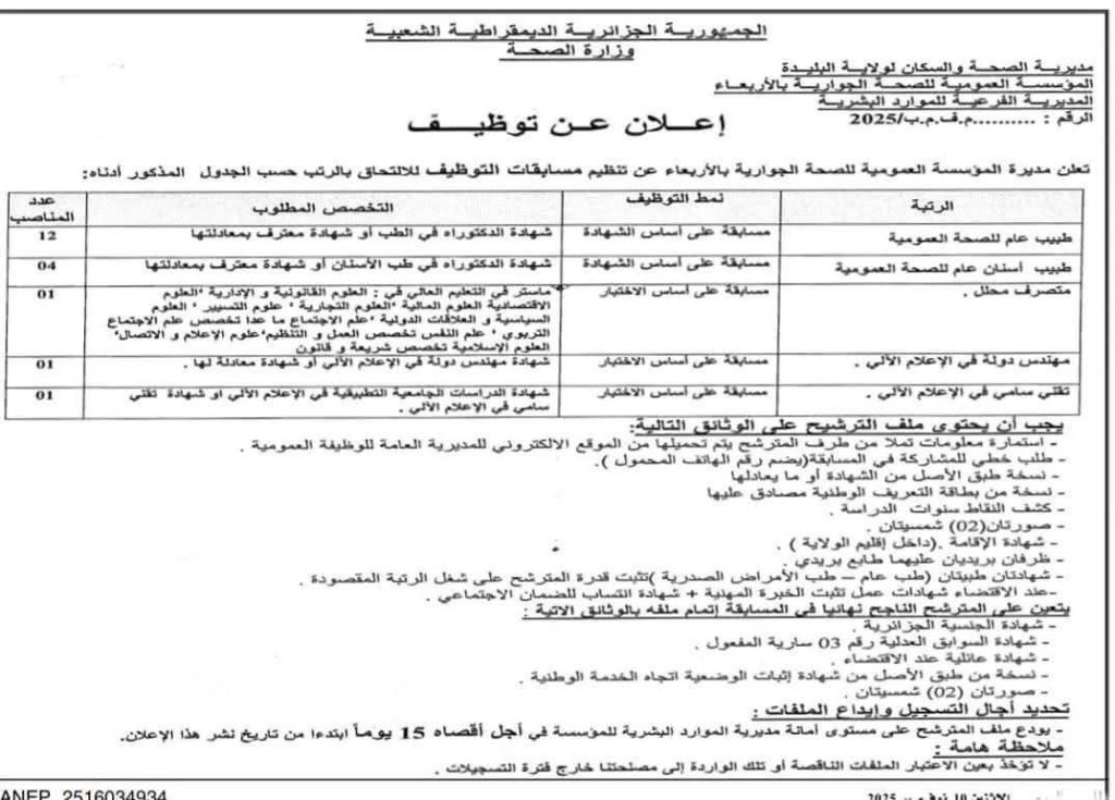 تعلن مديرة المؤسسة العمومية للمؤسسة الجوارية بالأربعاء عن تنظيم مسابقات التوظيف للالتحاق بالرتب حسب الجدول المذكور أدناه: