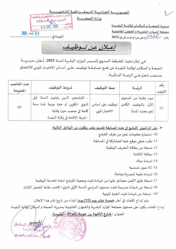 في إطار تنفيذ المخطط السنوي لتسيير الموارد البشرية لسنة 2025، تعلن مديرية الصحة والسكان لولاية البليدة عن فتح مسابقة توظيف على أساس الإختبار المهني للالتحاق بمنصب شغل في الرتبة التالية: