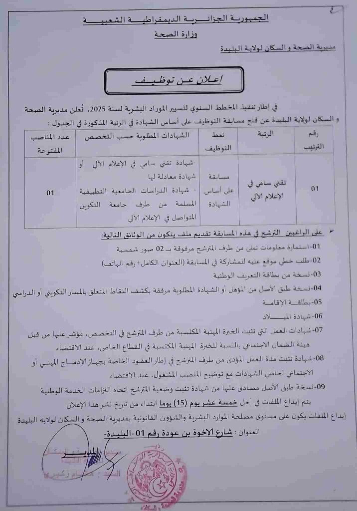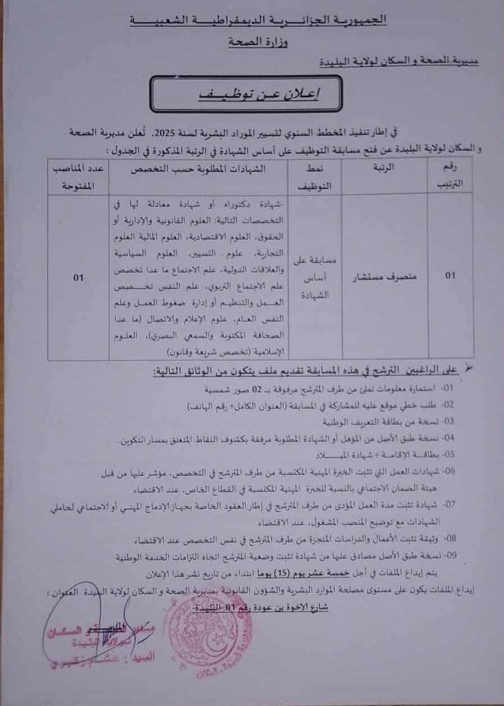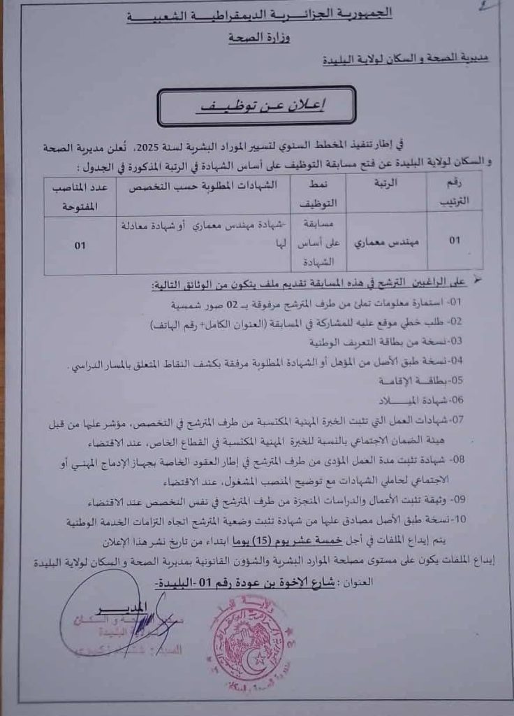 في إطار تنفيذ المخطط السنوي لتسيير الموارد البشرية لسنة 2025، تعلن مديرية الصحة والسكان لولاية البليدة عن فتح مسابقة التوظيف على أساس الشهادة في الرتبة المذكورة في الجدول: