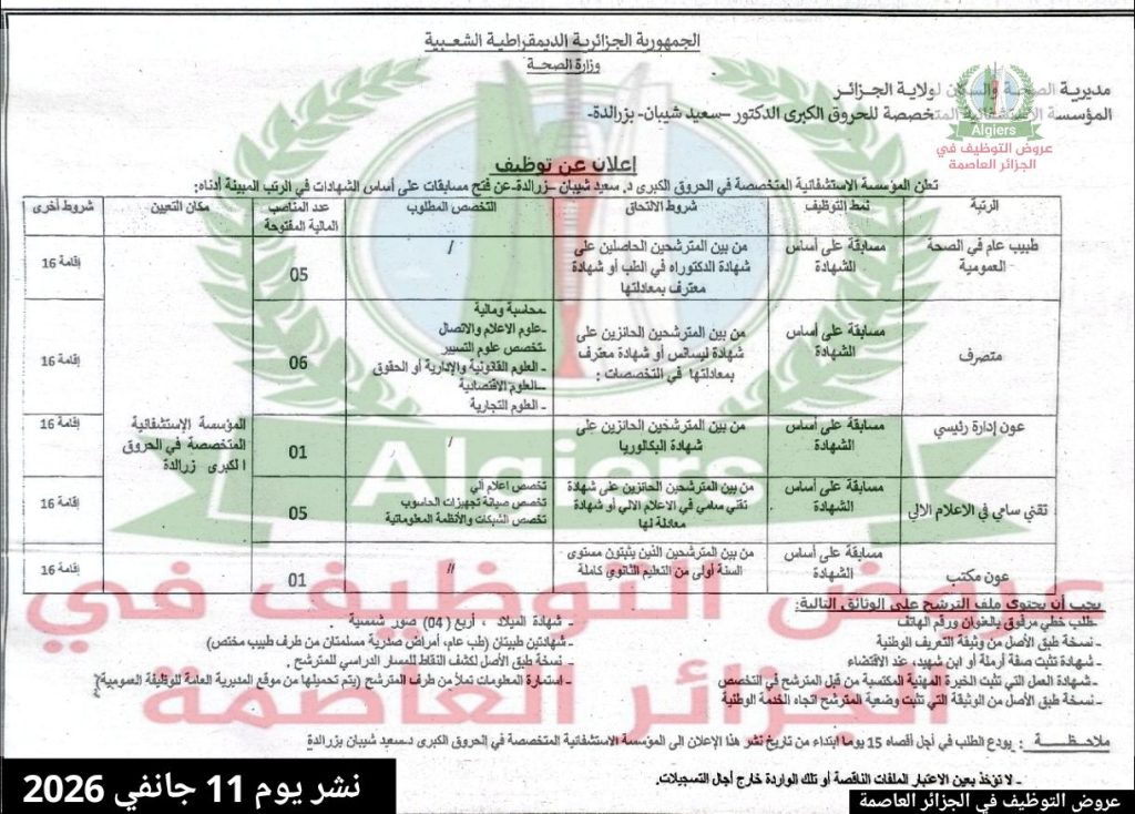 ملاحظة: يودع الملف في أجل أقصاه 15 يوماً ابتداءً من تاريخ نشر هذا الإعلان إلى المؤسسة الاستشفائية المتخصصة في الحروق الكبرى د. سعيد شيبان بزرالدة.