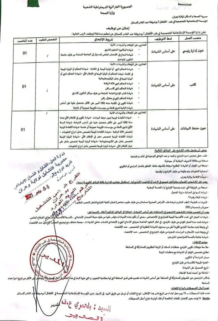 تعلم المؤسسة الاستشفائية المتخصصة في طب الأطفال بوخروفة عبد القادر مستشفى الأطفال وهران عن فتح مسابقة للتوظيف بصفة دائمة للرتب التالية: