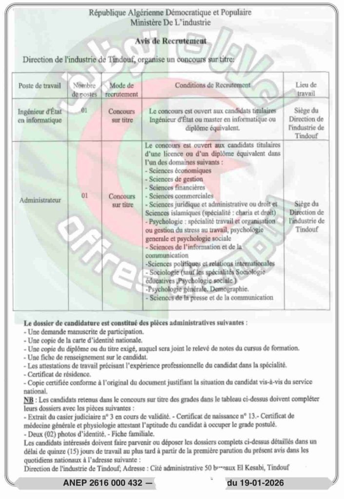 مهندس دولة في الاعلام الالي01مسابقة على أساس الشهادةتفتح المسابقة للمترشحين الحائزين على شهادة مهندس دولة أو ماستر في المعلوماتية أو شهادة معادلة لها.مقر مديرية الصناعة لتندوف