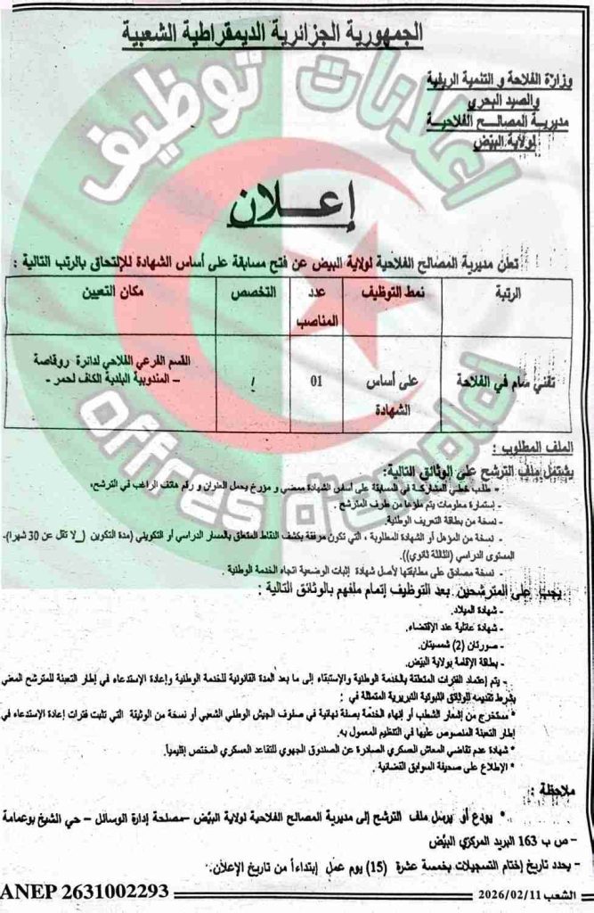 تعلن مديرية المصالح الفلاحية لولاية البيض عن فتح مسابقة على أساس الشهادة للالتحاق بالرتب التالية: