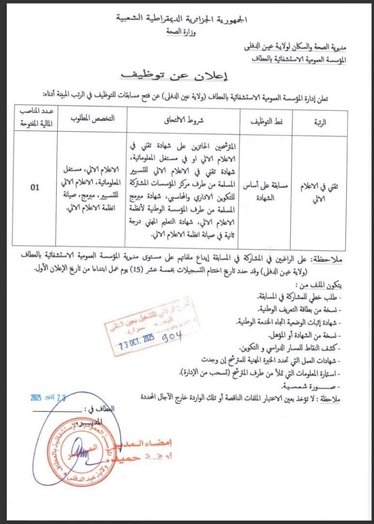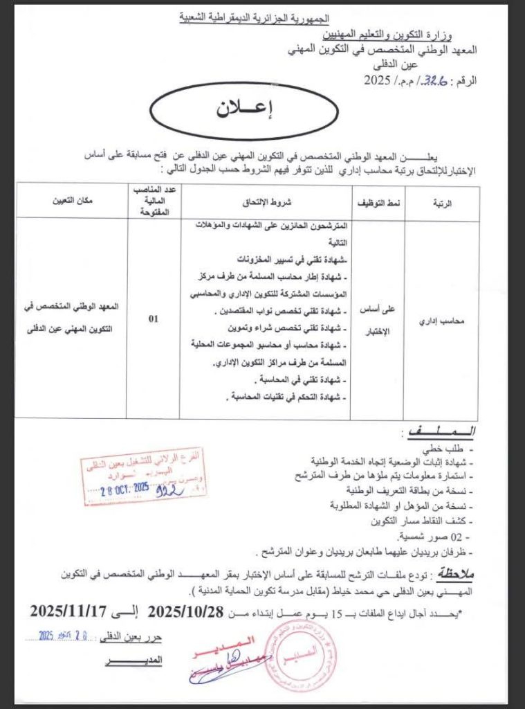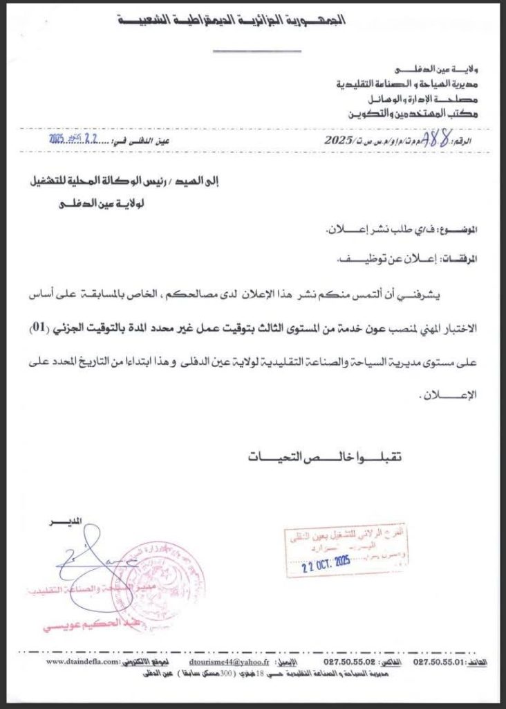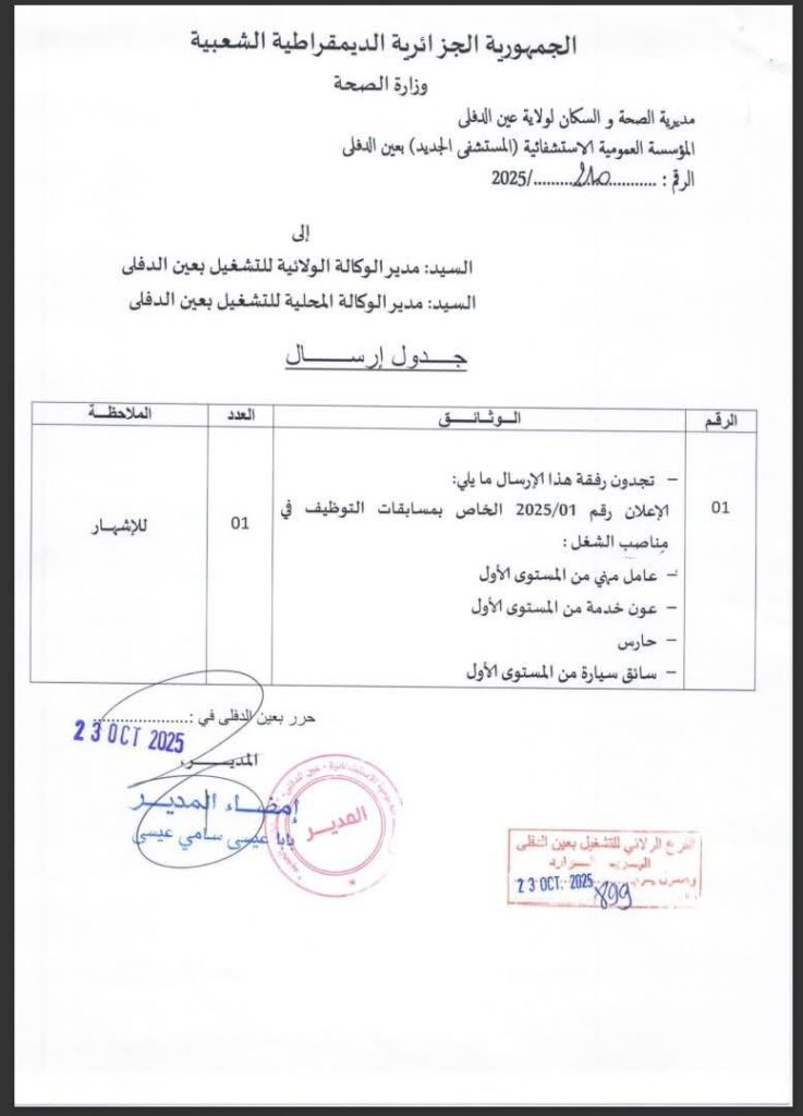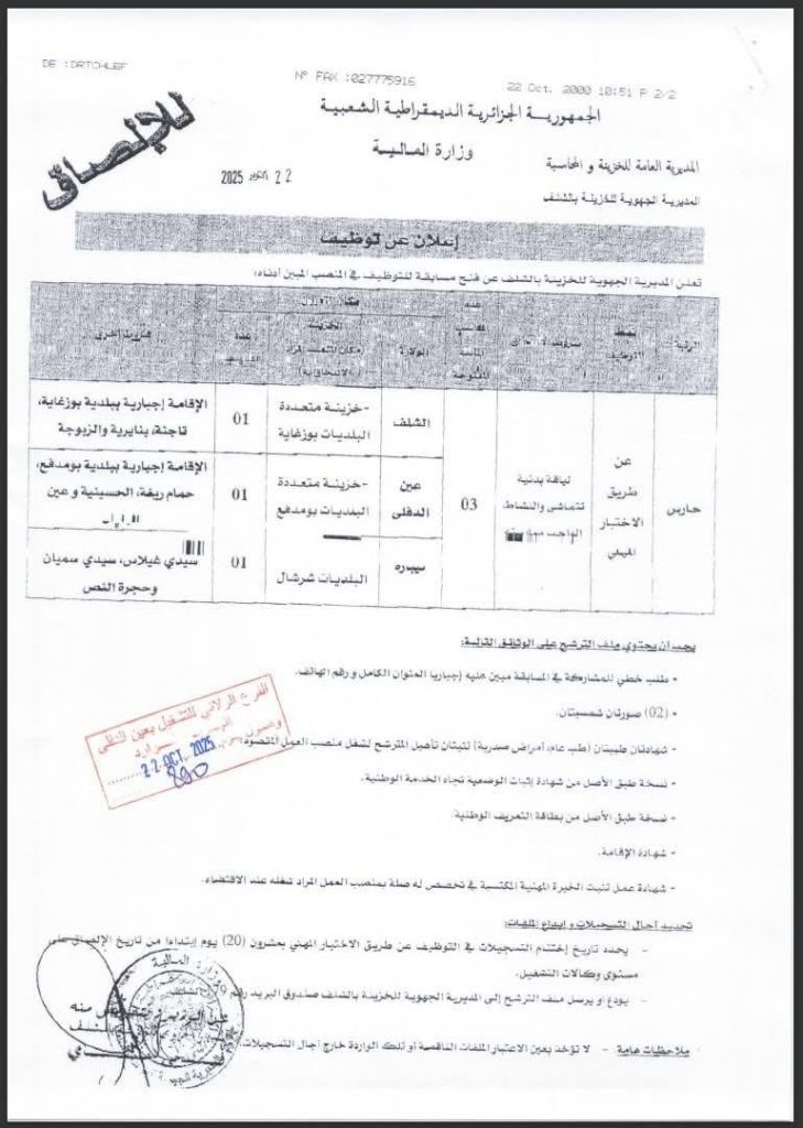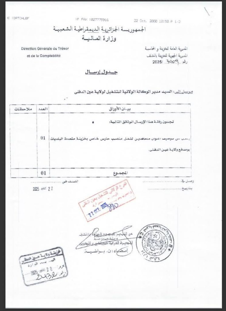 - الخزينة العامة والمحاسبة والمديرية الجهوية للخزينة بالشلف (وزارة المالية) – (مرفق بجدول إرسال إلى مدير الوكالة الولائية للتشغيل لولاية عين الدفلى).