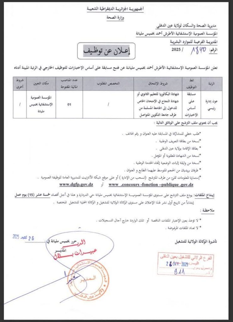 - المؤسسة العمومية الاستشفائية خميس مليانة (مديرية الصحة والسكان لولاية عين الدفلى).