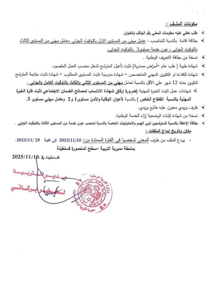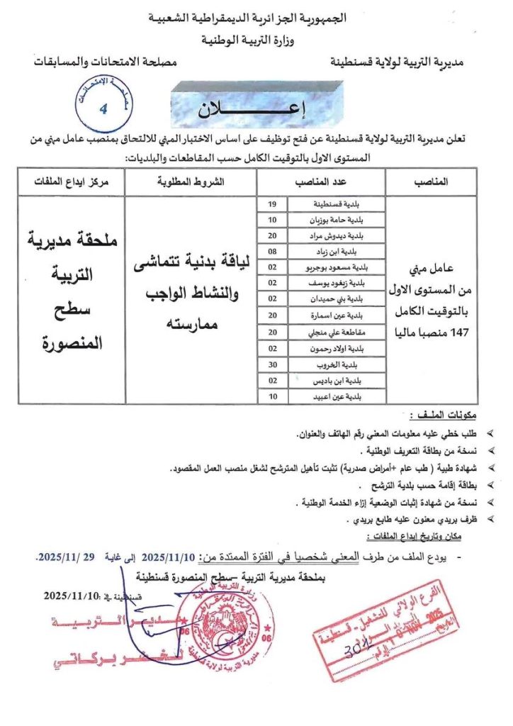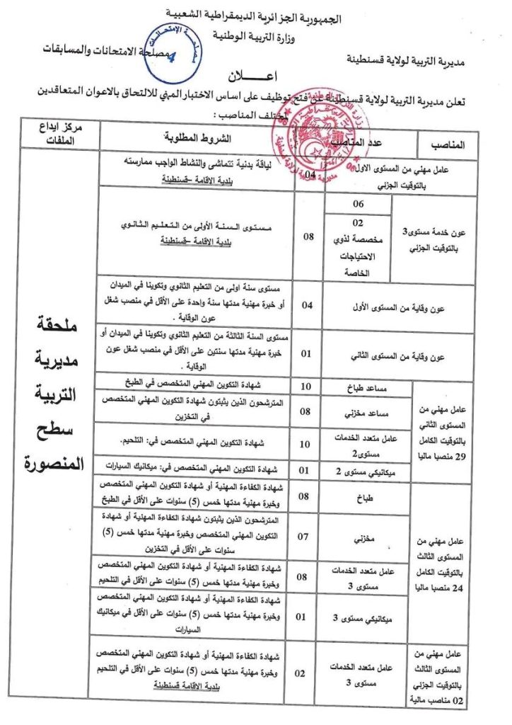 تعلن مديرية التربية لولاية قسنطينة عن فتح توظيف على أساس الاختبار المهني للالتحاق بمناصب عمال مهنيين المبينة في الصور ادناه: