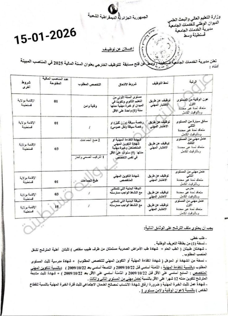 تعلن مديرية الخدمات الجامعية قسنطينة وسط عن فتح مسابقة للتوظيف الخارجي بعنوان السنة المالية 2025 في المناصب المبينة أدناه: