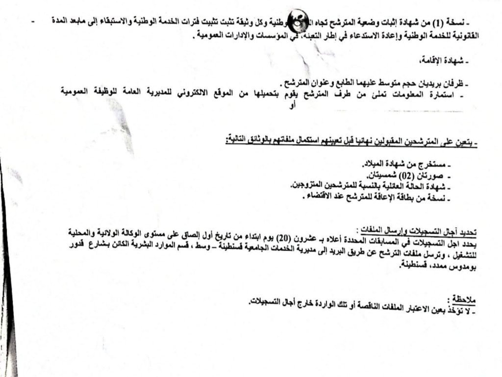 يحدد أجل التسجيلات في المسابقات المحددة أعلاه بـ عشرون (20) يوم ابتداءً من تاريخ أول إلصاق على مستوى الوكالة الولائية والمحلية للتشغيل، وترسل ملفات الترشح عن طريق البريد إلى مديرية الخدمات الجامعية قسنطينة – وسط، قسم الموارد البشرية الكائن بشارع قدور بومدوس ممدد، قسنطينة.