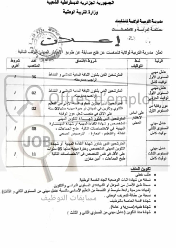 تعلن مديرية التربية لولاية تامنغست عن فتح مسابقة على طريق الاختبار المهني للرتب التالية: