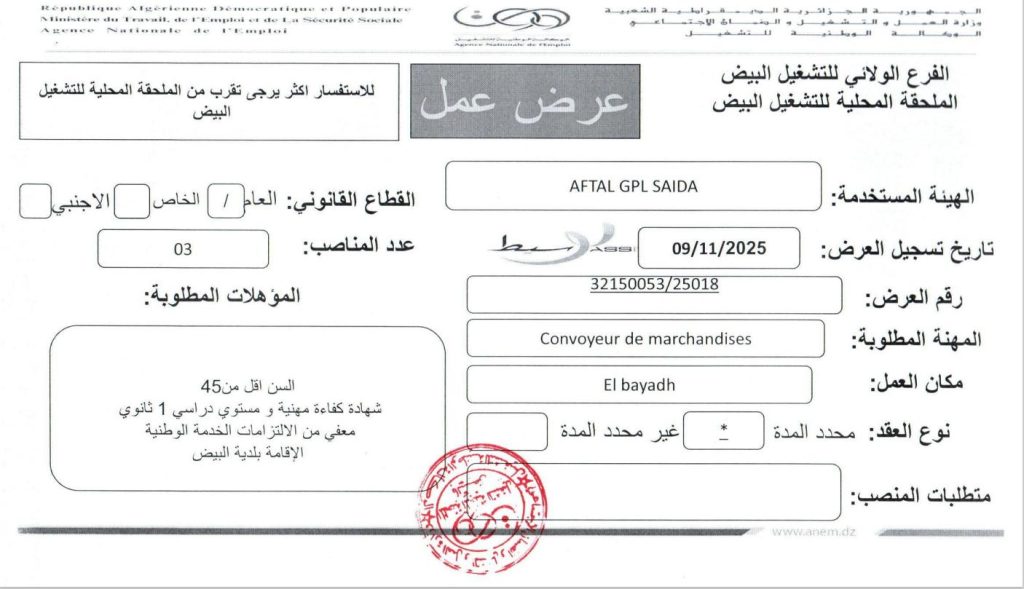 المهنة المطلوبة: Convoyeur de marchandises (ناقل بضائع)