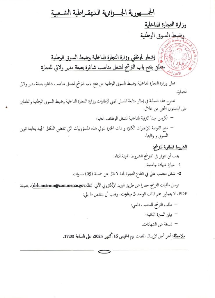 تعلن وزارة التجارة الداخلية وضبط السوق الوطنية عن فتح باب الترشح لشغل مناصب شاغرة بصفة مدير ولائي للتجارة.