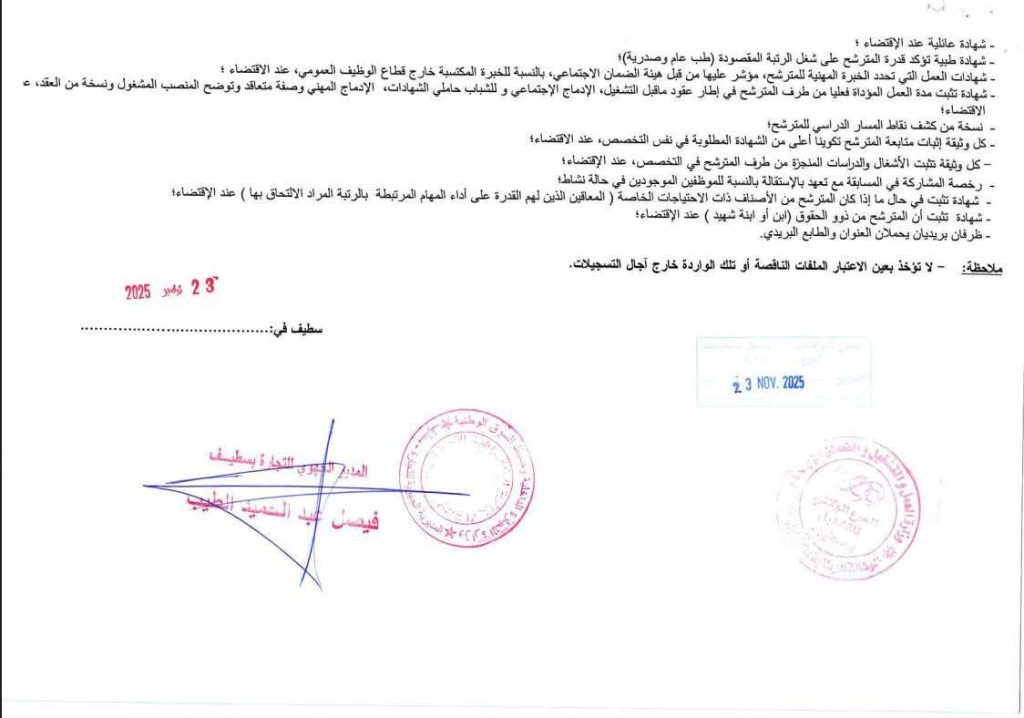 - شهادة تثبت مدة العمل المؤداة فعليًا من طرف المترشح في إطار عقود ما قبل التشغيل، الإدماج الاجتماعي و للشباب حاملي الشهادات، الإدماج المهني وصفة متعاقد و توضح المنصب المشغول ونسخة من العقد، عند الاقتضاء ؛