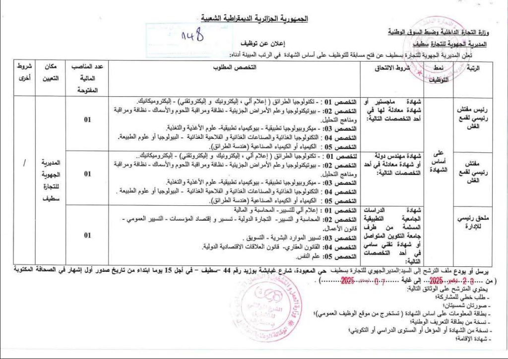 تعلن المديرية الجهوية للتجارة بسطيف عن فتح مسابقة للتوظيف على أساس الشهادة في الرتب المبينة أدناه: