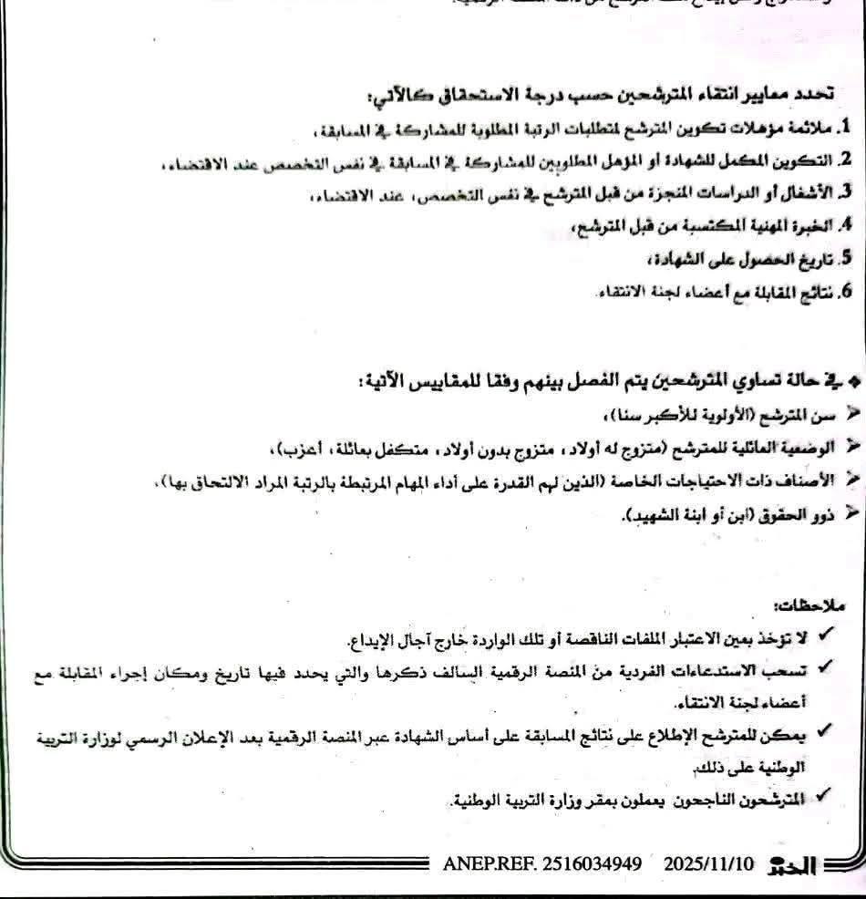تودع ملفات الترشح حصرياً عن بعد عن طريق المنصة الرقمية لوزارة التربية الوطنية “توظيف” عبر الرابط الالكتروني https://tawdif.education.dz، في أجل أقصاه خمسة عشر (15) يوم عمل ابتداء من تاريخ صدور أول إشهار في الصحافة المكتوبة.