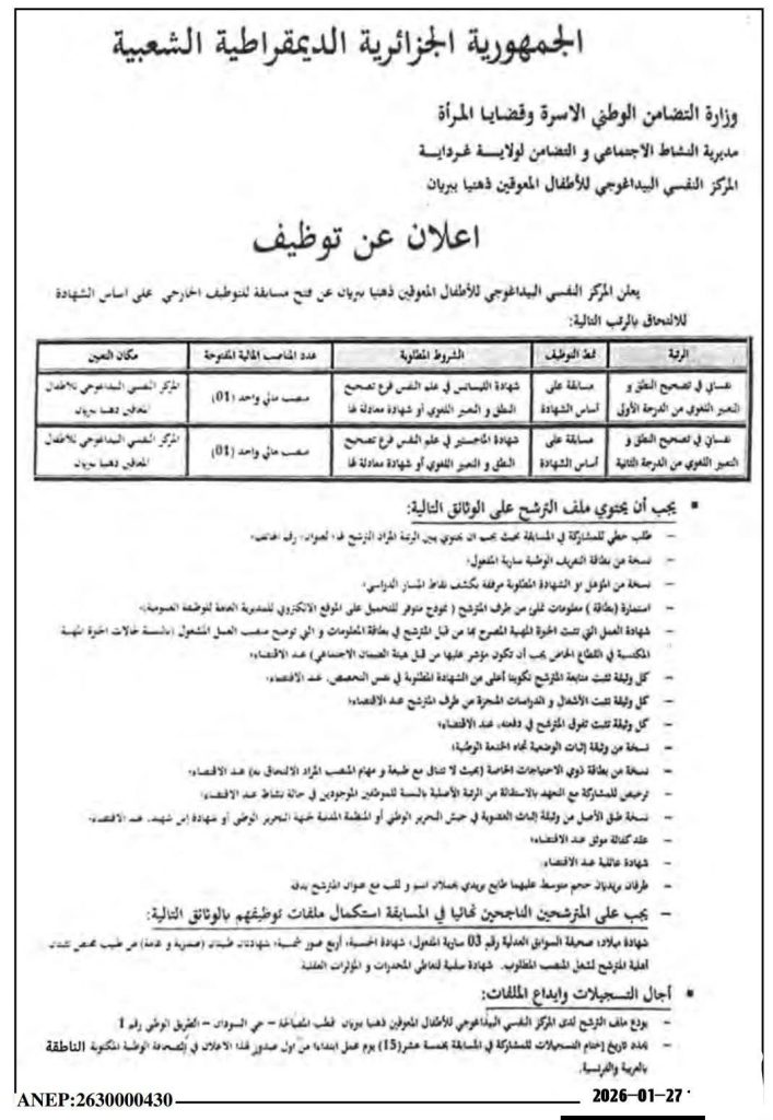 نفساني في تصحيح النطق والتعبير اللغوي من الدرجة الأولىمسابقة على أساس الشهادةشهادة الليسانس في علم النفس فرع تصحيح النطق والتعبير اللغوي أو شهادة معادلة لهامنصب مالي واحد (01)المركز النفسي البيداغوجي للأطفال المعوقين ذهنيا ببريان