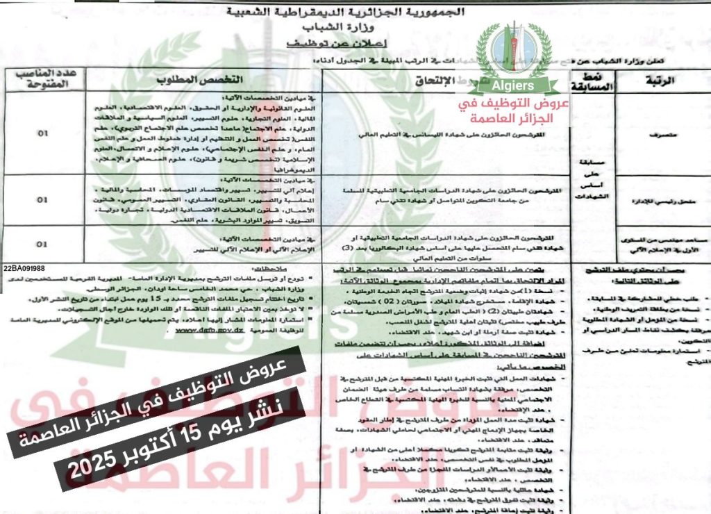 تعلن وزارة الشباب والرياضة عن فتح مسابقات توظيف على اساس الشهادات في الرتب المبينة ادناه:
