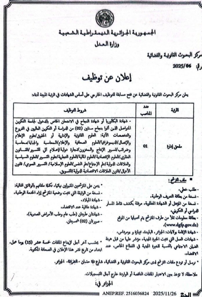 • ترسل أو تودع ملفات الترشح لدى مركز البحوث القانونية والقضائية، شارع عثمان -الحراش- الجزائر.