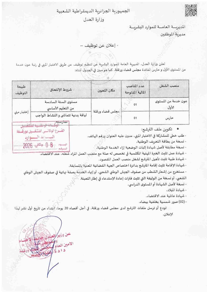 تعلن وزارة العدل، المديرية العامة للموارد البشرية عن تنظيم توظيف عن طريق الاختبار المهني في رتبة عون خدمة من المستوى الأول وحارس لفائدة مجلس قضاء ورقلة، كما هو مبين في الجدول أدناه:
