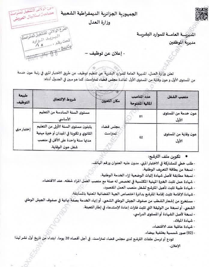 تعلن وزارة العدل، المديرية العامة للموارد البشرية عن تنظيم توظيف عن طريق الاختبار المهني في رتبة عون خدمة من المستوى الأول و عون وقاية من المستوى الأول لفائدة مجلس قضاء تمنراست، كما هو مبين في الجدول أدناه:
