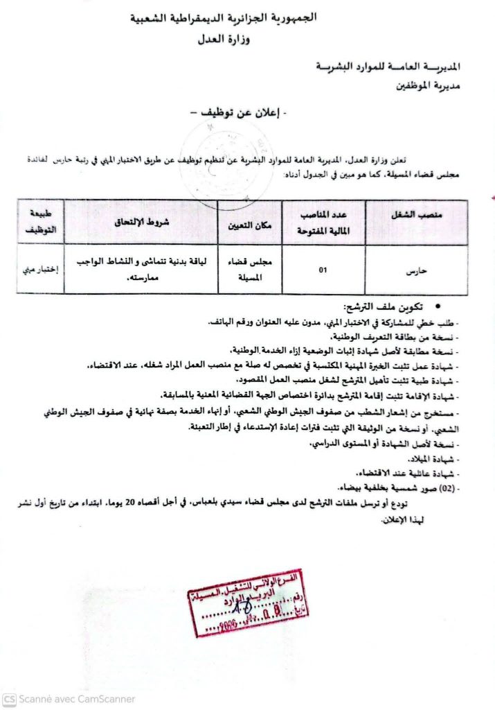 تعلن وزارة العدل، المديرية العامة للموارد البشرية عن تنظيم توظيف عن طريق الاختبار المهني في رتبة حارس لفائدة مجلس قضاء المسيلة، كما هو مبين في الجدول أدناه: