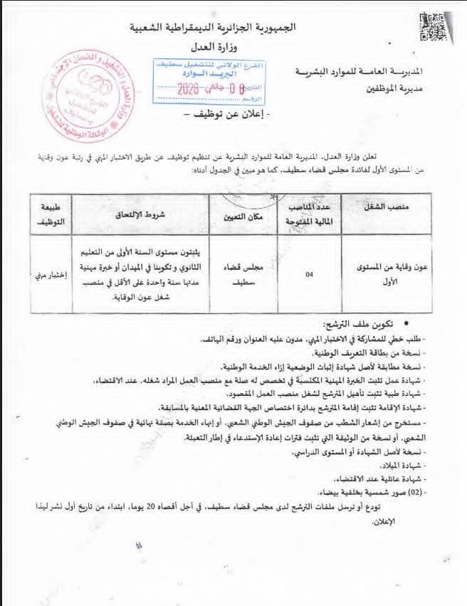 تعلن وزارة العدل، المديرية العامة للموارد البشرية عن تنظيم توظيف عن طريق الاختبار المهني في رتبة عون وقاية من المستوى الأول لفائدة مجلس قضاء سطيف، كما هو مبين في الجدول أدناه:
