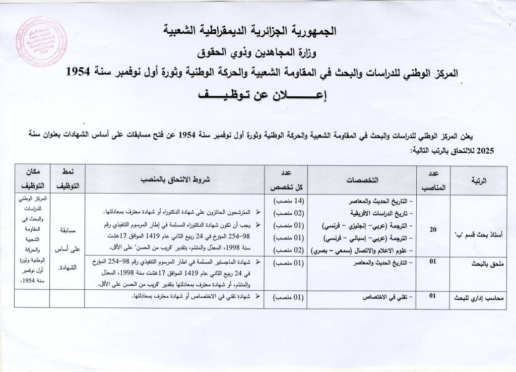 يعلن المركز الوطني للدراسات والبحث في المقاومة الشعبية والحركة الوطنية وثورة أول نوفمبر سنة 1954 عن فتح مسابقة على أساس الاختبار المهني للالتحاق بمنصب الشغل المحدد في الجدول التالي: