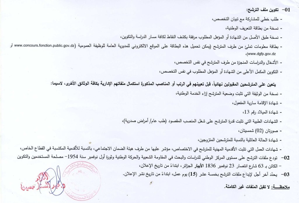 ملاحظة: لا تقبل الملفات غير الكاملة والملفات المرسلة أو المودعة خارج الآجال المحددة.