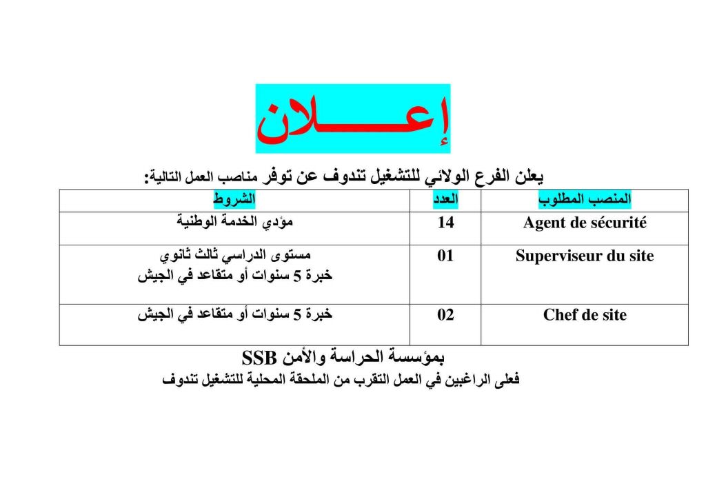 | Superviseur du site | 01 | مستوى دراسي ثالث ثانوي خبرة 5 سنوات أو متقاعد في الجيش |