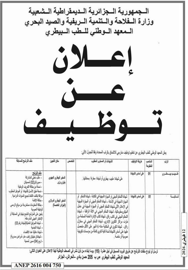 - إعلان عن توظيف بالمعهد الوطني للطب البيطري