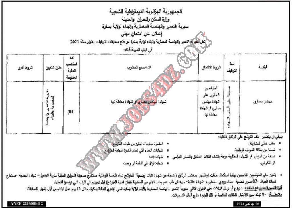 تعلن مديرية التعمير والهندسة المعمارية والبناء لولاية بسكرة عن فتح مسابقة توظيف على اساس الشهادات في المناصب التالية