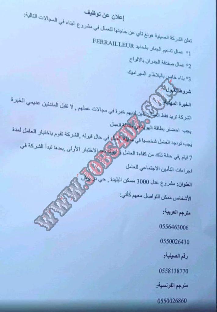 تعلن الشركة الصينية هونغ تاي عن حاجتها للعمال في مشروع البناء في المجالات التالية