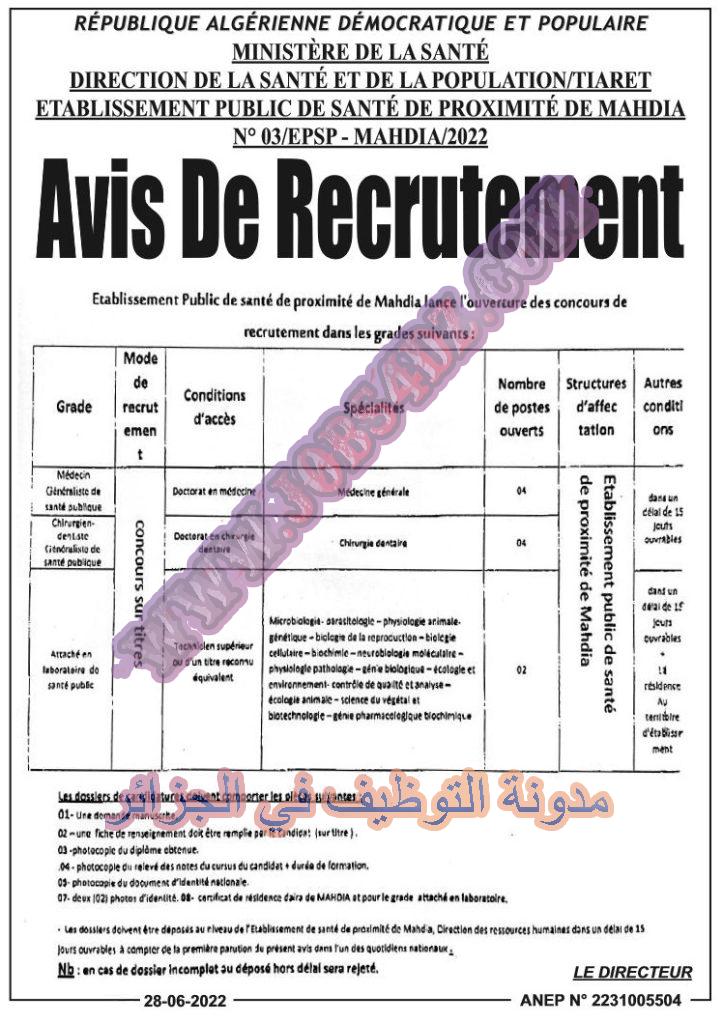 تعلن المؤسسة العمومية للصحة الجوارية مهدية تيارت عن فتح مسابقة توظيف على اساس الشهادة بعنوان السنة المالية 2022 في المناصب المبينة ادناه