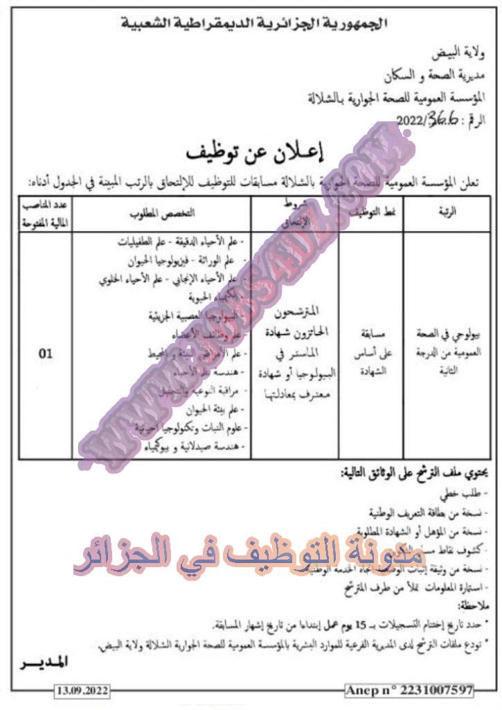 اعلان عن توظيف بالمؤسسة العمومية للصحة الجوارية بالشلالة البيض