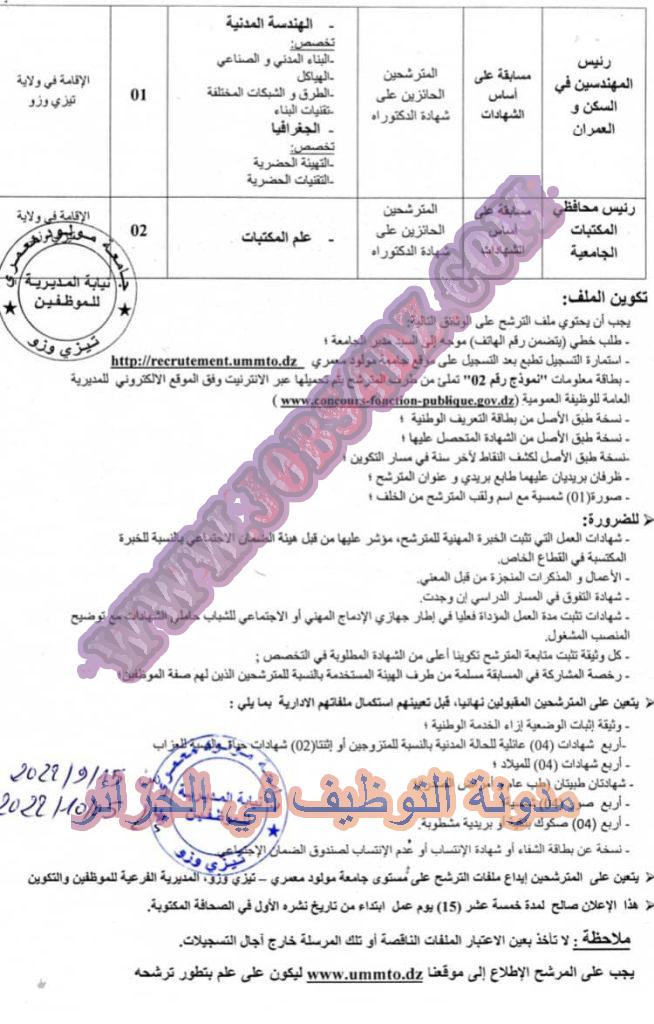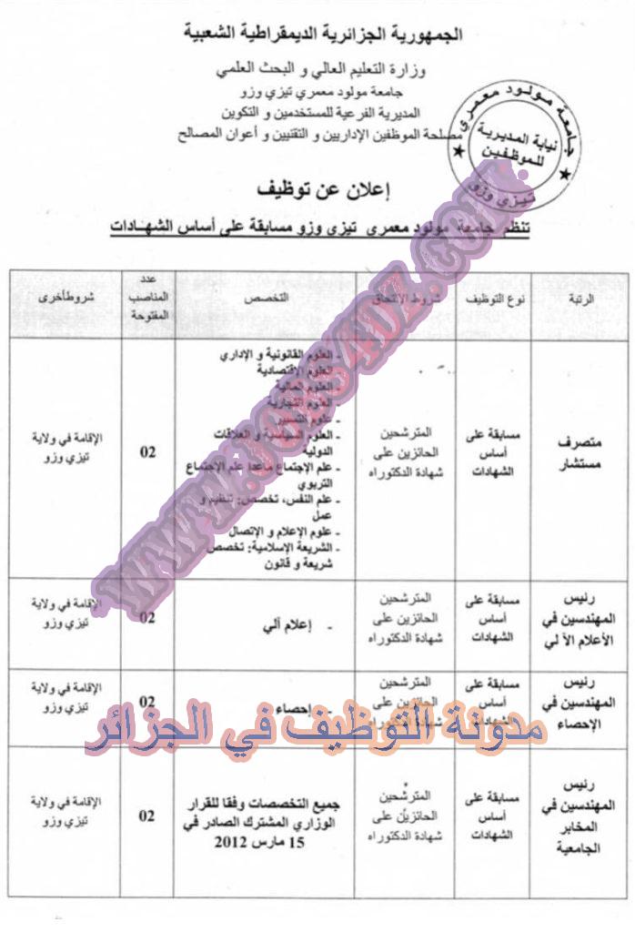 تعلن جامعة مولود معمري. تيزي وزو عن فتح مسابقة توظيف على اساس الشهادة وعلى اساس الاختبار المهني في الرتب المبينة ادناه