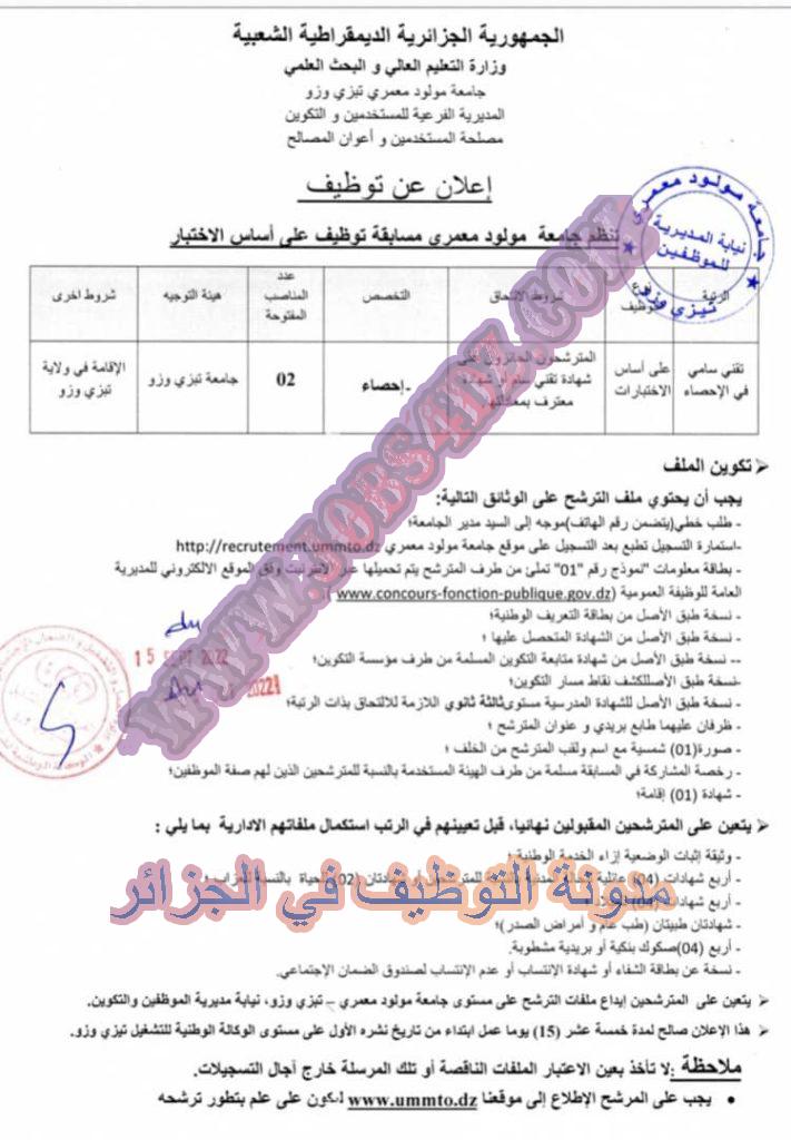 اعلان عن توظيف بجامعة مولود معمري تيزي وزو