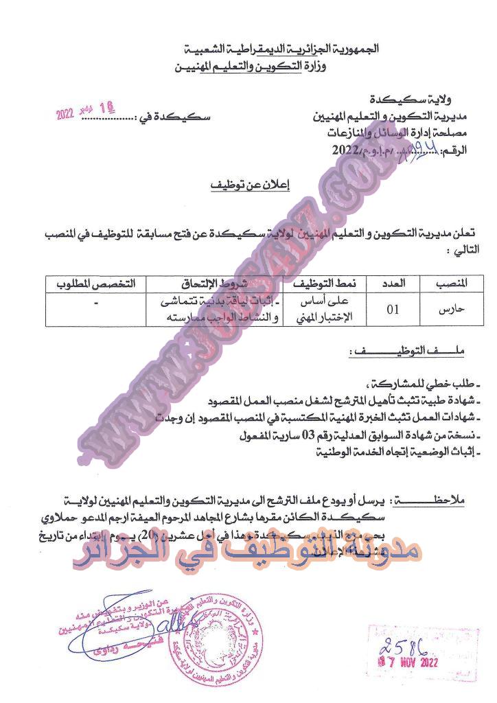 تعلن مديرية التكوين والتعليم المهنيين لولاية سكيكدة عن فتح مسابقات توظيف عن طريق الاختبار المهني في الرتب المبينة ادناه