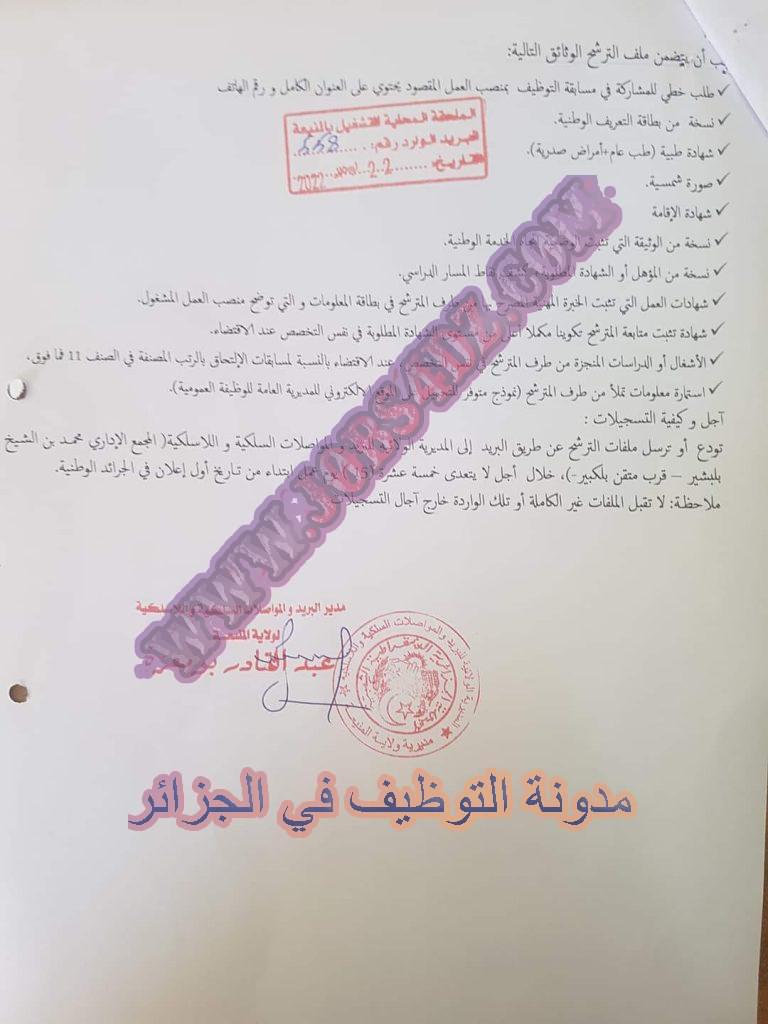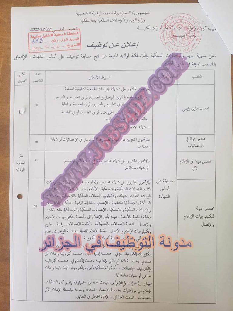 تعلن مديرية البريد والمواصلات السلكية واللاسلكية لولاية المنيعة عن فتح مسابقة توظيف على اساس الشهادة في الرتب المبينة ادناه