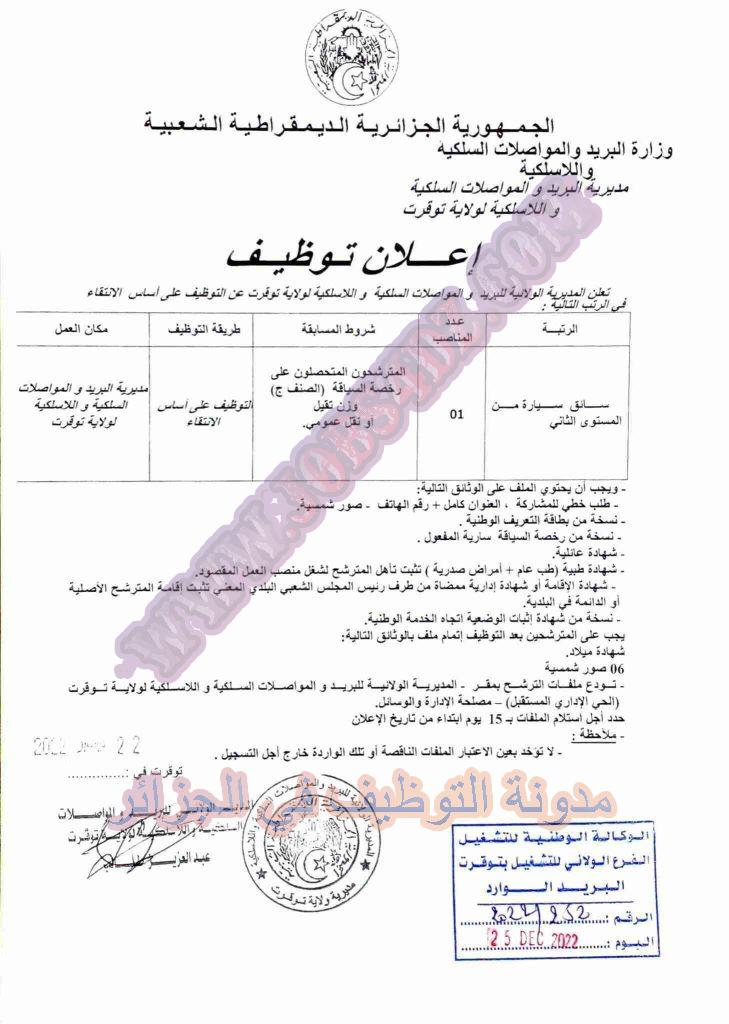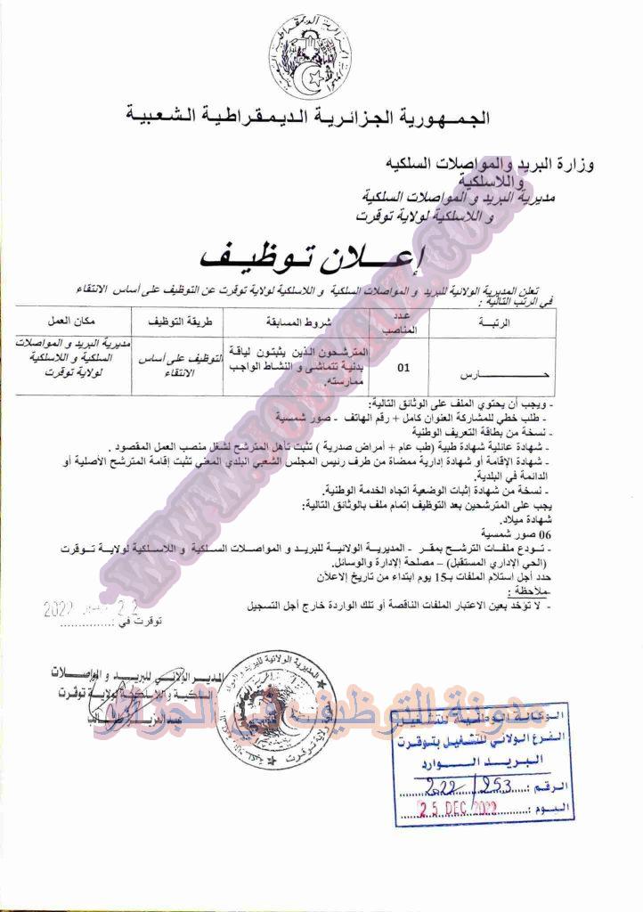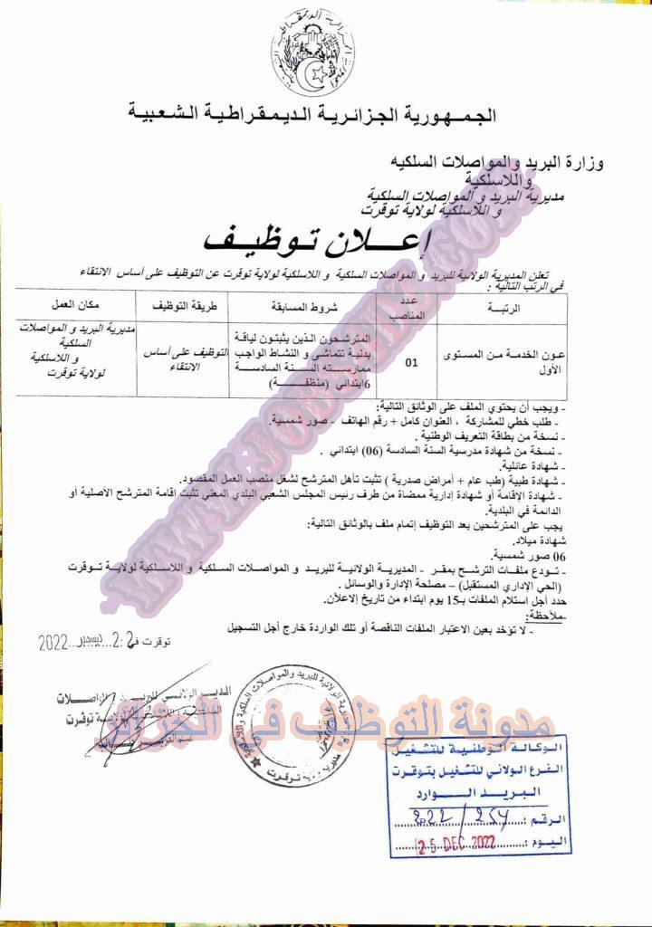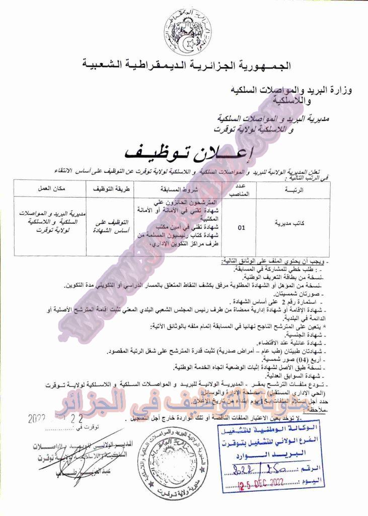 تعلن مديرية البريد والمواصلات السلكية و اللاسلكية لولاية تقرت عن فتح مسابقة توظيف على اساس الانتقاء وعلى اساس الشهادة في الرتب المبينة ادناه