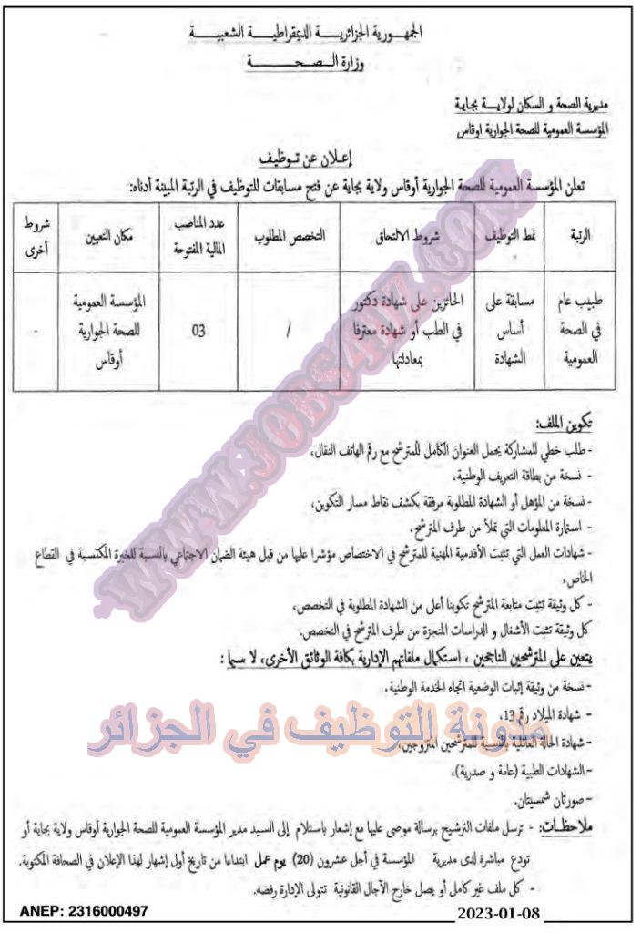 تعلن المؤسسة العمومية للصحة الجوارية اوقاس بجاية عن فتح مسابقة توظيف على اساس الشهادة في الرتب المبينة ادناه