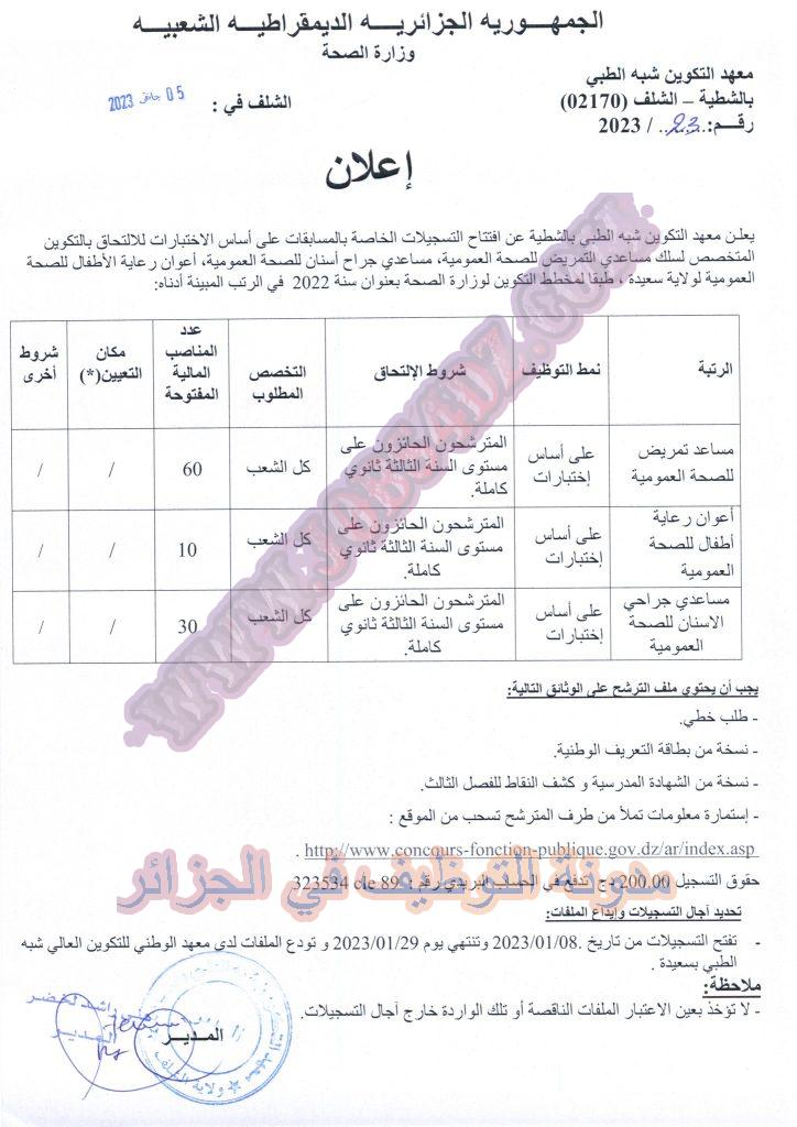 يعلن المعهد الوطني للتكوين العالي شبه الطبي بسعيدة عن افتتاح التسجيلات الخاصة بالمسابقات على اساس الاختبارات للالتحاق بالتكوين المتخصص لسلك مساعدي التمريض للصحة العمومية مساعدي جراحي الاسنان للصحة العمومية اعوان رعاية اطفال للصحة العمومية لولاية الشلف بعنوان سنة 2022 كما هو موضح ادناه