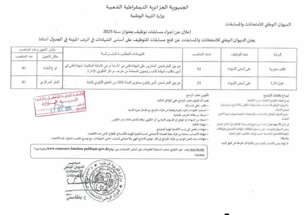 إعلان عن إجراء مسابقات توظيف بعنوان سنة 2025