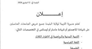 وزارة التربية الوطنية مديرية التربية لولاية البليدة مصلحة المستخدمين ads البليدة في: 12 فيفري 2026 إعـــــــــــلان تعلم مديرية التربية لولاية البليدة جميع خريجي الجامعات الحاصلين على شهادة الماجستير أو شهادة ماستر أو ليسانس في التخصصات التالي: التربية البدنية والرياضية في الأطوار الثلاث اللغة الفرنسية …