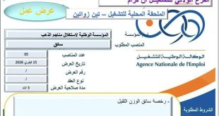 وزارة العمل، التشغيل والضمان الاجتماعي الوكالة الوطنية للتشغيل الفرع الولائي للتشغيل ان قزام الملحقة المحلية للتشغيل – تين زواتين ads عرض عمل اسم المؤسسة: المؤسسة الوطنية لاستغلال مناجم الذهب المنصب المطلوب: سائق عدد المناصب: 05 تاريخ العرض: 15 فيفري 2026 مدة صلاحية العرض: 3 …