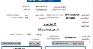 الملحقة المحلية للتشغيل مستغانم عرض عمل مؤسسة DIVINDUS SPA ads تعلن الملحقة المحلية للتشغيل مستغانم عن عرض عمل بمؤسسة DIVINDUS SPA كما هو موضح ادناه الهيئة المستخدمة مؤسسة DIVINDUS SPA المناصب المطلوبة امينة مديرية عدد المناصب: 01 عون حراسة ومراقبة عدد المناصب: 01 طبيعة …