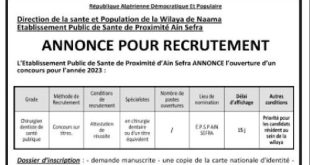 اعلان عن توظيف المؤسسة العمومية للصحة الجوارية عين الصفراء النعامة ads تعلن المؤسسة العمومية للصحة الجوارية عين الصفراء النعامة عن فتح مسابقة توظيف على اساس الشهادة في الرتب المبينة ادناه جراح اسنان في الصحة العمومية عدد المناصب / نمط التوظيف مسابقة على اساس الشهادة …