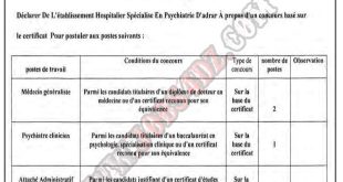 اعلان عن توظيف المؤسسة الإستشفائية المتخصصة في الأمراض العقلية بأدرار ads يعلن المؤسسة الإستشفائية المتخصصة في الأمراض العقلية بأدرار عن فتح مسابقة توظيف على اساس الشهادة في الرتب المبينة ادناه طبيب عام عدد المناصب 02 منصب نمط التوظيف مسابقة على اساس الشهادة Psychiatre clinicien …