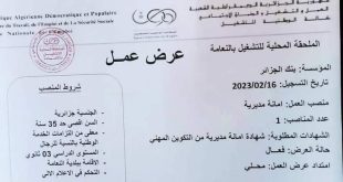 عرض عمل الملحقة الملحية للتشغيل سطيف ads عروض عمل على مستوى الملحقة الملحية للتشغيل سطيف في المناصب المبينة ادناه الملحقة الملحية للتشغيل الجلفة عروض عمل على مستوى الملحقة الملحية للتشغيل الجلفة في المناصب المبينة ادناه الملحقة الملحية للتشغيل المنصورة تلمسان عروض عمل على مستوى …