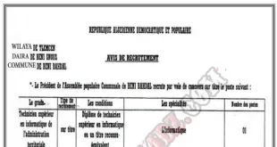 أكمل القراءة »اعلان توظيف ببلدية بني بهدل تلمسان